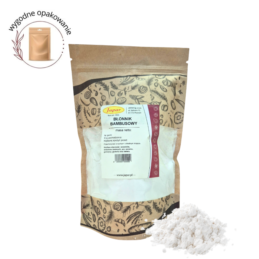 Błonnik bambusowy przypomina puszysty, suchy proszek o jasnym kolorze, który niemal znika w potrawie – nie zostawia posmaku, nie zmienia zapachu ani barwy. Dzięki swojej strukturze doskonale wiąże wilgoć, nadając lekkości ciastom, a napojom – jedwabistą gładkość. W kuchni jest jak niewidzialny sprzymierzeniec – robi dobrą robotę, nie ujawniając swojej obecności.