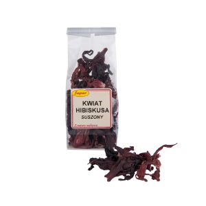 Suszony kwiat hibiskusa to aromatyczny dodatek do naparów i herbat. Charakteryzuje się intensywnym kolorem i lekko kwaskowym smakiem. Wzbogaca smak napojów i domowych mieszanek ziołowych.