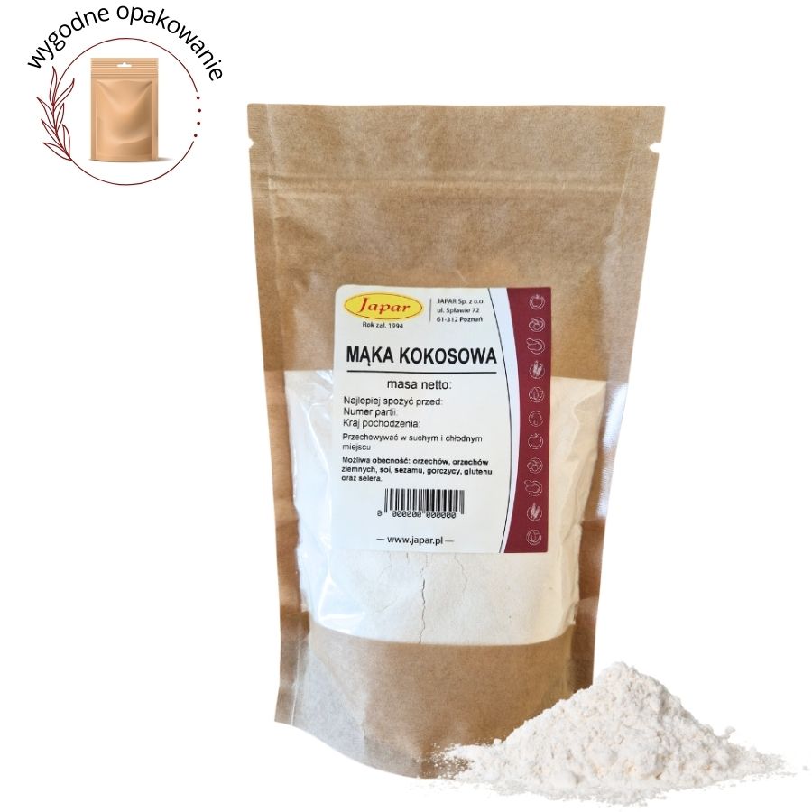 Mąka kokosowa to aromatyczna, bezglutenowa mąka z miąższu kokosa. Idealna do wypieków, naleśników, deserów i zagęszczania sosów. Naturalnie słodka, bogata w błonnik i białko.