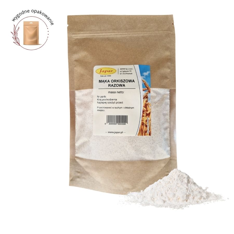 Mąka orkiszowa razowa to pełnoziarnista alternatywa dla zwykłej mąki pszennej. Zawiera więcej błonnika i składników mineralnych. Doskonała do chleba, bułek, naleśników i ciast o wyrazistym smaku.