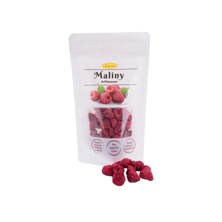 Maliny liofilizowane to doskonała, zdrowa przekąska, która zachowuje wszystkie cenne składniki odżywcze i intensywny smak świeżych malin. Idealne do musli, jogurtów, deserów, a także jako samodzielna przekąska.