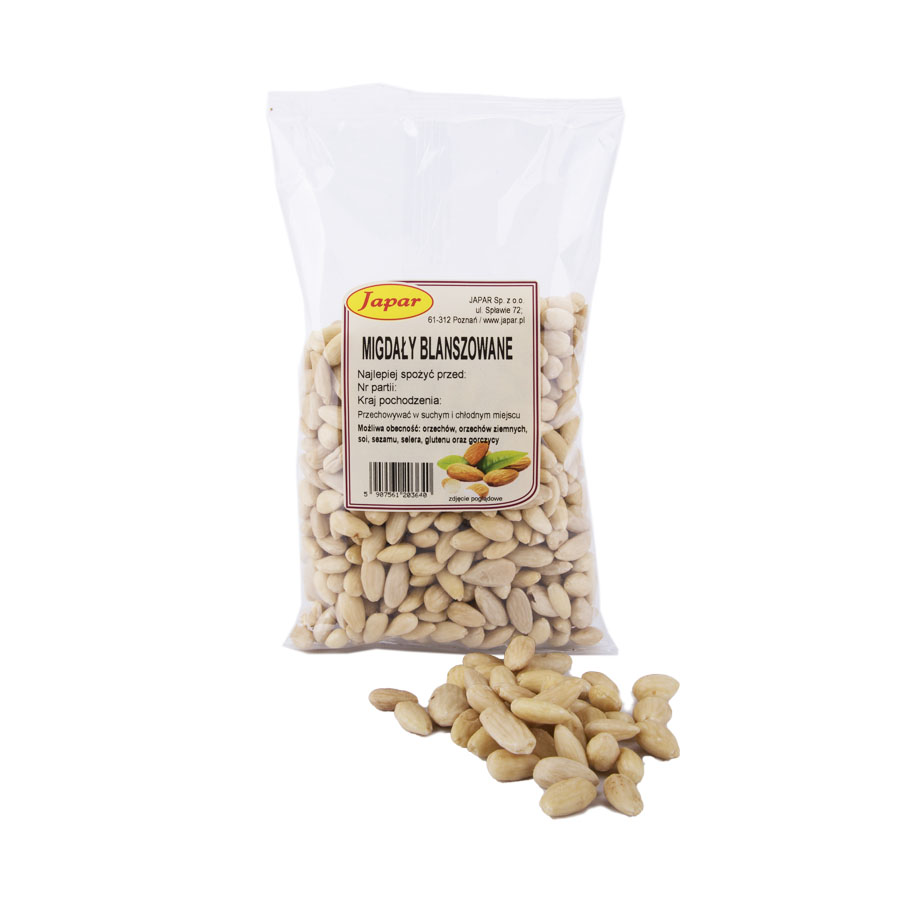 Migdały blanszowane o delikatnym smaku i chrupiącej teksturze. Idealne do wypieków, deserów, musli i jako przekąska. Źródło zdrowych tłuszczy i białka.