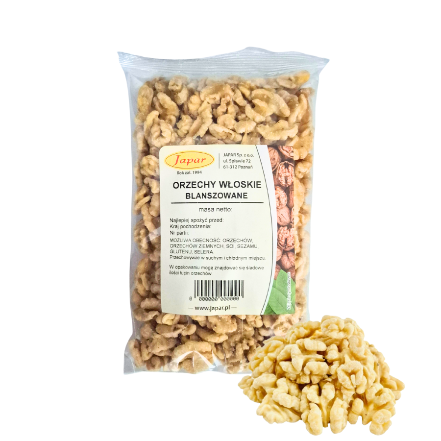 Orzechy włoskie blanszowane to delikatniejsze w smaku, pozbawione gorzkiej skórki orzechy o szerokim zastosowaniu w kuchni. Idealne jako zdrowa przekąska lub dodatek do dań i wypieków.