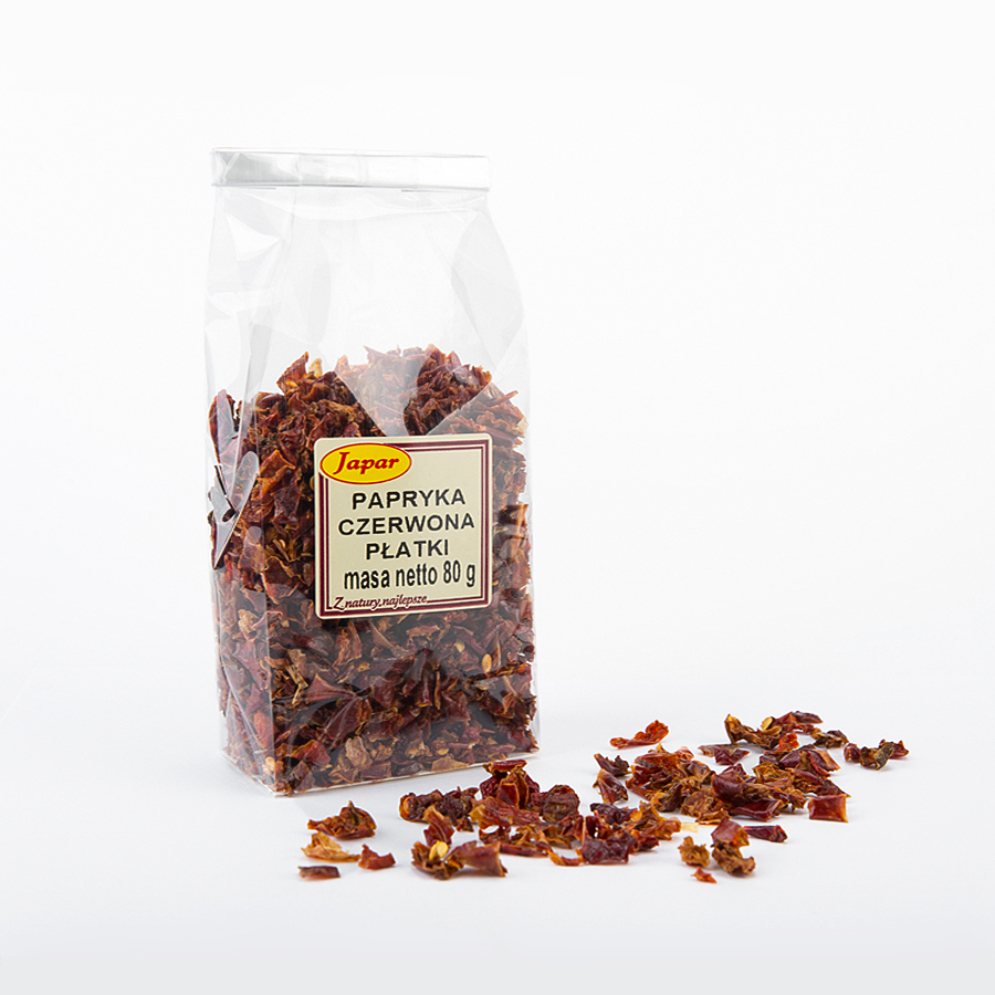 Płatki papryki mają lekką, delikatnie chrupiącą konsystencję i przyjemny, owocowy aromat z nutą naturalnej słodyczy. W smaku są łagodne, ale wyraziste, z lekkim akcentem dojrzałej papryki. Ich subtelna struktura sprawia, że pięknie wtapiają się w potrawy, nadając im apetyczny wygląd i głęboki, pełny smak. To doskonały sposób na podkreślenie charakteru ulubionych dań!