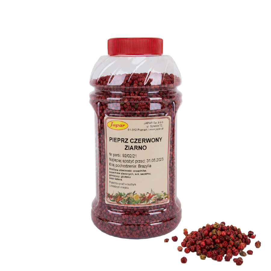 Pieprz czerwony w ziarnach wyróżnia się delikatniejszym smakiem i subtelną słodyczą. Doskonały do mięs, ryb, sałatek i dań kuchni egzotycznej. Ozdobi potrawy nie tylko smakiem, ale i wyglądem.