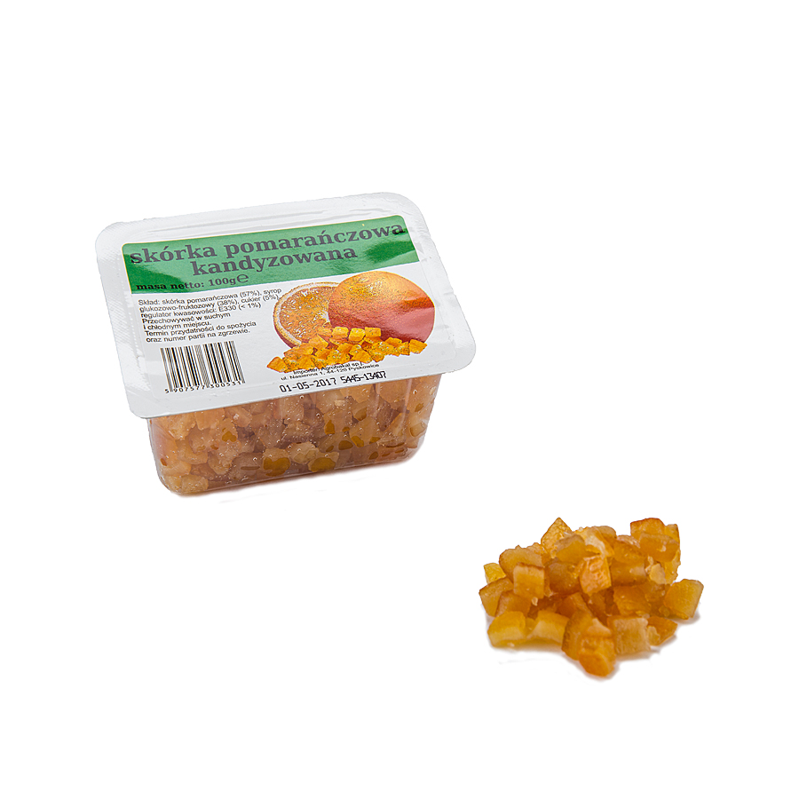 Skórka pomarańczowa 57%, syrop glukozowo-fruktozowy 38%, cukier 5%, regulator kwasowości E330 (
